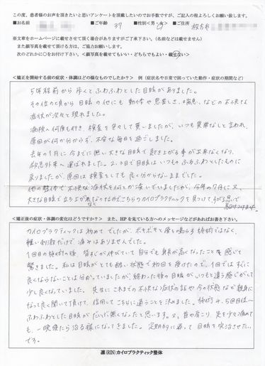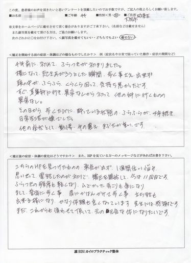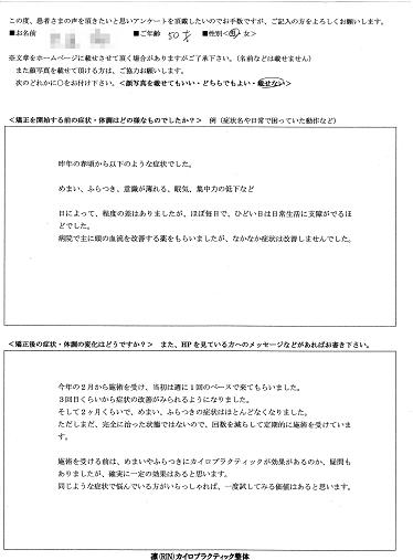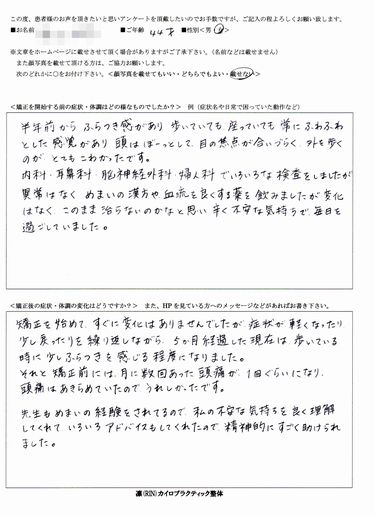 施術を受ける前は、めまいやふらつきにカイロプラクティックが効果があるのか、疑問もありましたが、確実に一定の効果はあると思います。
