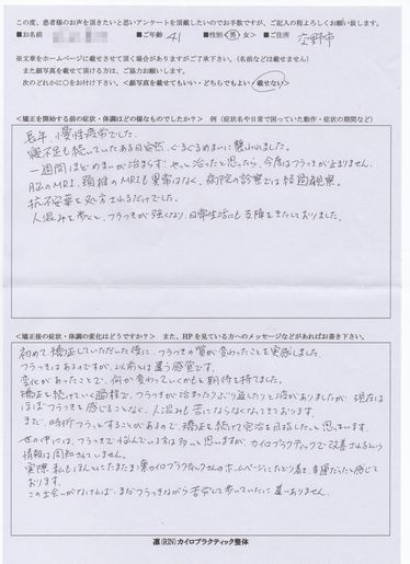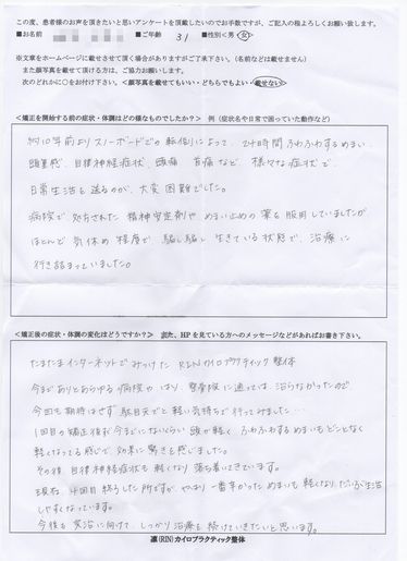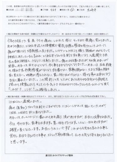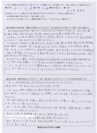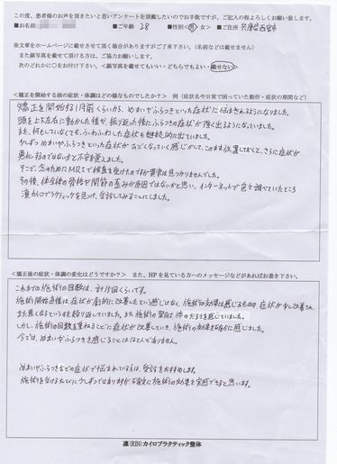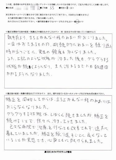 退院して、3ヶ月経っても症状が変わらないので、インターネットで「目まい」と検索して、RINカイロプラティック整体を見つけ、患者さんのアンケート、先生の体験談を読んで矯正しようと、一度は予約しましたが、都合がつかず、キャンセルしたこともあります。