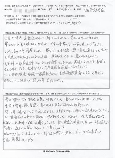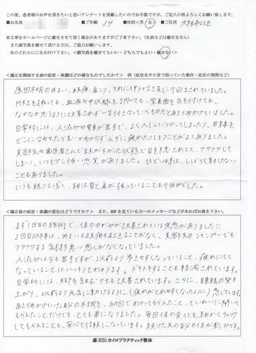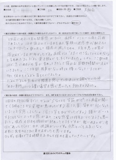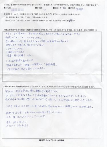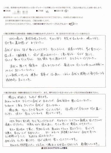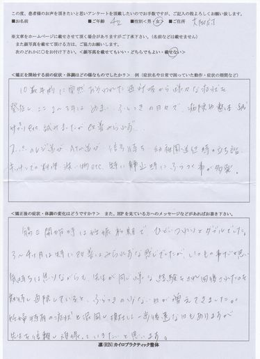 色々な病院で治療を行っても改善されず、途方に暮れていましたが、矯正を繰り返すごとに良くなっていることが実感でき、心身ともに助けられました。
