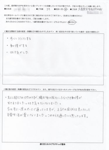 友人に紹介されてきたのですが、矯正後は徐々にふらつきや動悸がおさまりました。