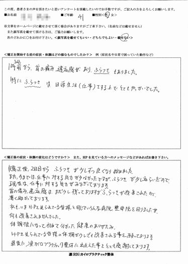 首の痛み、違和感は、まだ少し残っておりますが、ふらつきが改善されたので、凄く助かっております。