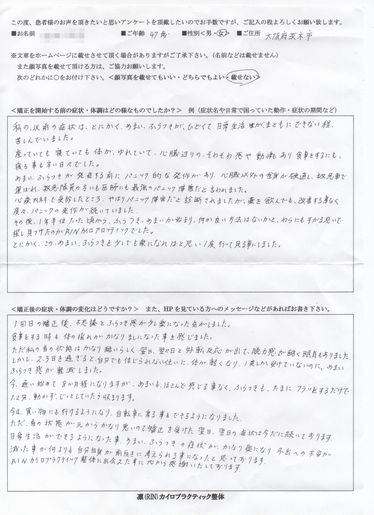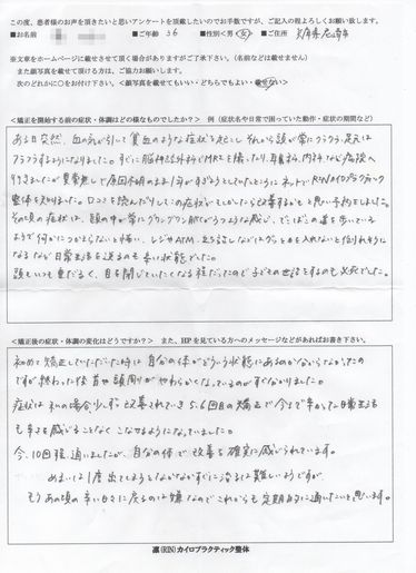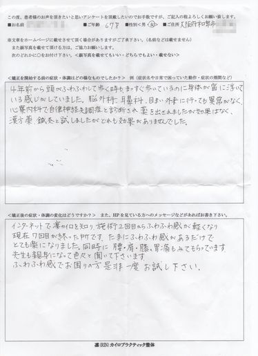 矯正が始まり、痛くも気持ち良くもなく、ただ全身に少し触れてるだけな感じで「これでなおるの?」と思いましたが、終了後「あれっ?」と思う位に、ある程度めまいが治まり、頭もスッキリして、本当にビックリしました。