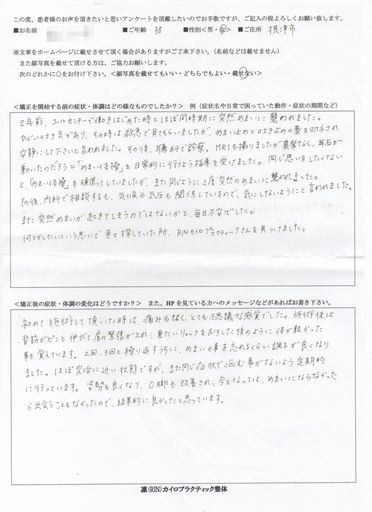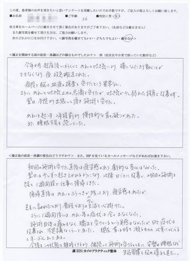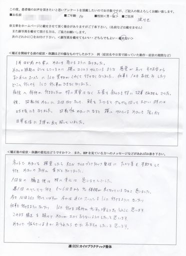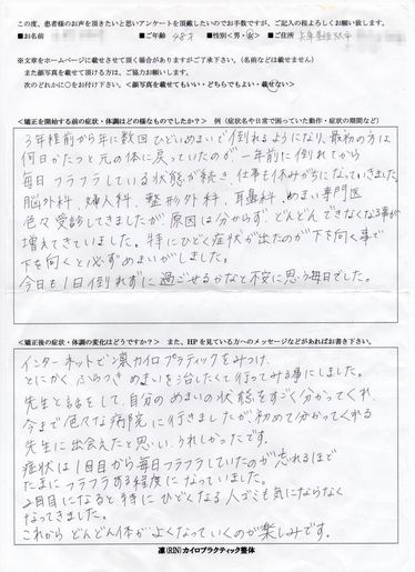 今までマッサージや整体を受けた事がなく、カイロはバキバキして筋を痛めるとか、イメージが悪かったのですが、患者さんのコメントや先生自身がめまいを患ってた事をHPで見て、ここなら治るかもと思い駆け込みました。