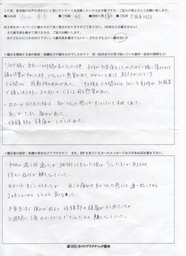施術数時間後、仕事をしていて眩暈が大分楽になり思考能力が回復していることに気が付きました。