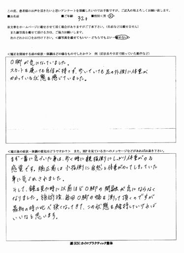 凛カイロさんに通っているうちに、1ヶ月半を過ぎた頃だったと思いますが、正座ができる様になり、その時は本当に嬉しくて「もう全く痛くないです!!」と先生にお伝えしたことを覚えています。