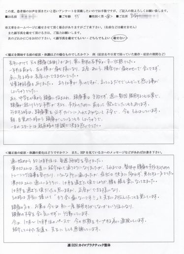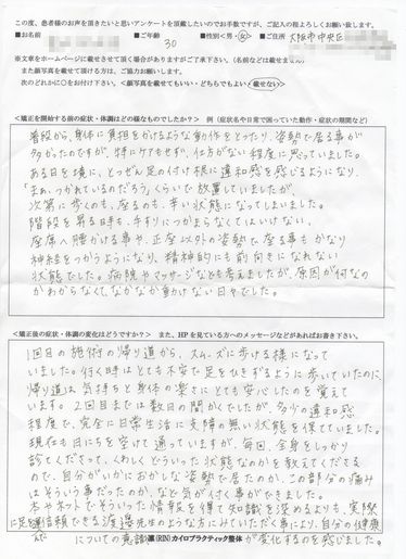 徐々にですが、確実に良くなっていることを実感できるので、これからも先生を信頼して、通い続けようと思います。
