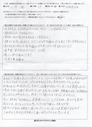 現在も日にちを空けて通っていますが、毎回全身をしっかりみてくださって、詳しくどういった状態なのかを教えてくださるので、自分がいかにおかしな状態で居たのか、この部分の痛みはそういう事だったのか、など気が付く事ができました。