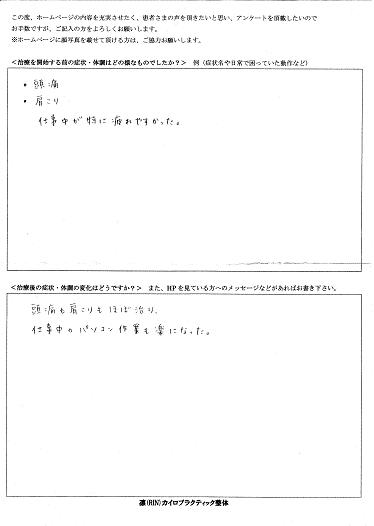 頭痛も肩こりもほぼ治り、仕事中にパソコン作業も楽になった。