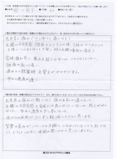 長年にかけて元々、腰痛(右側)があり、常に身体の右半分が辛い状態でした。